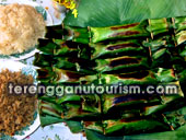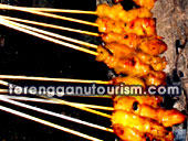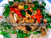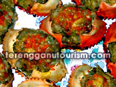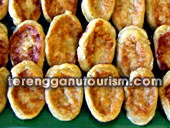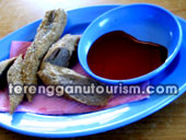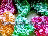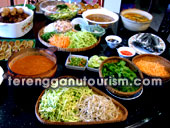 Mak Ngah Nasi Dagang, opens 07:00 - 11:00 am. Best stall to go for nasi dagang is Mak Ngah Nasi Dagang, a little stall about 2km from Kuala Ibai bridge, by the road of Chendering. Early bird always catches its meal. Nasi dagang in Mak Ngah’s stall always sold out before 11:00am. Other alternative will be at any stalls in Kuala Terengganu which offer quite similar taste. Nasi Minyak John at Jalan Petani, beside AEON building. Opens 09:00-10:30am. Nasi minyak or ghee rice is another typical food for this state. It is normally eaten with vegetable pickles and Chicken, egg or beef curry. Meka at Jalan Sultan Omar, Mat Binjai at Jalan Sultan Sulaiman and Misya at Batu Buruk Hawker Centre. Opens 11:00-2:30pm: Offers large selection of Terengganu traditional kampung dishes such as fried ayam kampung (free range chicken), bovine lungs, grilled fish, grilled squid etc. Ulam or the Malay salad is a combination of raw vegetables such as ulam raja, cucumber, petai(stink beans), pegaga etc. Some are more unfamiliar, like daun kentut, daun kudu, cekur, daun larak and kucing seduduk etc. It is eaten with rice or just dip into sambal belacan, budu (fish sauce) or tempoyak (fermented durian paste). There is piping hot white rice to go with the dishes. Kedai Nasi Kerabu, Opens 11:00-3:30pm. Located right across from the main entrance to Wisma Darul Iman (the Terengganu state government buildings). Nasi kerabu, a dish of rice tinted bright blue and eaten with ulam, fried salted fish, fish crackers and other garnishings. The blue which comes from the petals of bunga telang (clitoria) used in the cooking variety is the most common, but there are many versions depending on the colour of the rice. Prices are a bit more expensive here but they have good local specialties. Central Market (08:00am-2:00pm) and Foods warong along Jalan Sultan Sulaiman (4:00pm-12:00pm) : Serves numerous good local Malay food. Try Laksam is quite similar to the western pasta except the wheat and rice flour mixing dough is steamed but not boiled. It is eat with boiled and pureed fish gravy which is mixed with coconut milk. Some warong serves good nasi lemak, Nasi lemak is another typical Malay food. The rice is cooked with coconut milk then eaten with ikan bilis, sambal, slices of cucumber, egg and peanut. Besides the main menu, there are a numbers of Malay dessert or little eat in Terengganu traditional Malay menu. Keropok is cracker made of fish which is ground to a paste then mixed with sago before it is steamed and later deep fried. It is the snack instead of a proper meal and sometimes is served as the snack before meal. It can be eaten either when it is steamed or deep fried, both give different taste. The long chewy ones are called keropok lekor while the thin crispy are called keping, means slice. Both the keropok is usually eaten with chili dip.Keropok is easily found elsewhere in Kuala Terengganu, from the stalls beside the road to restaurants or market. If you wish to bring home some, go to the Central Market for dried keropok or fresh in Losong who is famous with largest Museum in Malaysia and its keropok. Kak Yah's stall is the most popular at Losong, prof of that is Kak Yah magnificents house located next to her stall. Some say stall 007 near Floating Mosque is the best among this, well, find it out yourself. Satar is another fish snack in Terengganu Malay cuisine. It is mixture of pounded fish, shallots and ginger wrapped in banana leaf, pierce of few by 1 single bamboo stick then barbecue over low fire. The best stall are by the road of Chendering, sold by an old couple in a Ford Vargon or Warung Che Wan at Kuala Kemaman if not, you can try your luck at Central Market. Onde Onde, a very tangy and fluffy, Malay delicacy, with grated nuts as fillings and generously coated with a layer of coconut gratings. Solok Lada, Chillies suffed with fish paste which has beed spiced with ginger and coconut milk. Pulut Inti, a kind of dry rice pudding made from glutinous rice & coconut milk as the topping. It is cooked by steaming. The dessert rice is topped with fresh grated coconut sweetened with palm sugar. It is traditionally wrapped in banana leaves folded into a pyramid shape. Roti Jala, 'net bread’ or crepes is a net or lacy type of crepe, which sometimes replaces the staple rice, made from a crepe-like batter. A special cup or mould with small holes is used to make the lacy crepe which is cooked over a hot griddle. Roti Jala is often served during special occasions and is an ideal accompaniment to dishes with lots of rich curries or gravies like Malaysian Chicken Curry, Chicken Kapitan, or Mutton Kurma. Pulut Lepa made of glutinous rice and fish, this snack food is prepared over a barbecue. Boiled fish meat is mixed with sliced onions, and dried chilies and coconut. The mixture is cooked until it is dry. This is then used as a filling for the glutinous rice rolls. Wrappings of banana leaf cover the food before it is cooked over the fire. Rendang, is the meat dish that is prepared with coconut milk, chilies, onions and other condiments. Eaten with rice, the tasty tender meat is a delectable dish. It is a must at most Malay functions. Nekbat is a light dessert made of rice flour and eggs, prepared in a mould over a light fire. When it turns yellow and puffy it is to be eaten with syrup flavoured by pandan leaf. Ketupat sotong is squid stuffed with glutinous rice bathed in a sea of cooked and thick coconut milk. The stuffing is soaked in coconut milk before it is put in the squids. Lompat tikam is a sweet cold dessert made out of coconut milk and rice flour flavoured by pandan leaf. Akak Cooked in a mould, eaten sweet or savoury. The sovoury version has a spiced beef filling and sweet version is pandan flavoured. Buah Gomok is sweetmeat made out of glutinous rice flour, a filing of shredded coconut and a dark brown sugar derived from the coconut tree as well as powered fried green peas. Bronok is sweetmeat made out of boiling