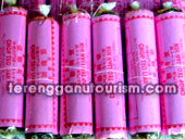 Mak Ngah Nasi Dagang, opens 07:00 - 11:00 am. Best stall to go for nasi dagang is Mak Ngah Nasi Dagang, a little stall about 2km from Kuala Ibai bridge, by the road of Chendering. Early bird always catches its meal. Nasi dagang in Mak Ngah’s stall always sold out before 11:00am. Other alternative will be at any stalls in Kuala Terengganu which offer quite similar taste. Nasi Minyak John at Jalan Petani, beside AEON building. Opens 09:00-10:30am. Nasi minyak or ghee rice is another typical food for this state. It is normally eaten with vegetable pickles and Chicken, egg or beef curry. Meka at Jalan Sultan Omar, Mat Binjai at Jalan Sultan Sulaiman and Misya at Batu Buruk Hawker Centre. Opens 11:00-2:30pm: Offers large selection of Terengganu traditional kampung dishes such as fried ayam kampung (free range chicken), bovine lungs, grilled fish, grilled squid etc. Ulam or the Malay salad is a combination of raw vegetables such as ulam raja, cucumber, petai(stink beans), pegaga etc. Some are more unfamiliar, like daun kentut, daun kudu, cekur, daun larak and kucing seduduk etc. It is eaten with rice or just dip into sambal belacan, budu (fish sauce) or tempoyak (fermented durian paste). There is piping hot white rice to go with the dishes. Kedai Nasi Kerabu, Opens 11:00-3:30pm. Located right across from the main entrance to Wisma Darul Iman (the Terengganu state government buildings). Nasi kerabu, a dish of rice tinted bright blue and eaten with ulam, fried salted fish, fish crackers and other garnishings. The blue which comes from the petals of bunga telang (clitoria) used in the cooking variety is the most common, but there are many versions depending on the colour of the rice. Prices are a bit more expensive here but they have good local specialties. Central Market (08:00am-2:00pm) and Foods warong along Jalan Sultan Sulaiman (4:00pm-12:00pm) : Serves numerous good local Malay food. Try Laksam is quite similar to the western pasta except the wheat and rice flour mixing dough is steamed but not boiled. It is eat with boiled and pureed fish gravy which is mixed with coconut milk. Some warong serves good nasi lemak, Nasi lemak is another typical Malay food. The rice is cooked with coconut milk then eaten with ikan bilis, sambal, slices of cucumber, egg and peanut. Besides the main menu, there are a numbers of Malay dessert or little eat in Terengganu traditional Malay menu. Keropok is cracker made of fish which is ground to a paste then mixed with sago before it is steamed and later deep fried. It is the snack instead of a proper meal and sometimes is served as the snack before meal. It can be eaten either when it is steamed or deep fried, both give different taste. The long chewy ones are called keropok lekor while the thin crispy are called keping, means slice. Both the keropok is usually eaten with chili dip.Keropok is easily found elsewhere in Kuala Terengganu, from the stalls beside the road to restaurants or market. If you wish to bring home some, go to the Central Market for dried keropok or fresh in Losong who is famous with largest Museum in Malaysia and its keropok. Kak Yah's stall is the most popular at Losong, prof of that is Kak Yah magnificents house located next to her stall. Some say stall 007 near Floating Mosque is the best among this, well, find it out yourself. Satar is another fish snack in Terengganu Malay cuisine. It is mixture of pounded fish, shallots and ginger wrapped in banana leaf, pierce of few by 1 single bamboo stick then barbecue over low fire. The best stall are by the road of Chendering, sold by an old couple in a Ford Vargon or Warung Che Wan at Kuala Kemaman if not, you can try your luck at Central Market. Onde Onde, a very tangy and fluffy, Malay delicacy, with grated nuts as fillings and generously coated with a layer of coconut gratings. Solok Lada, Chillies suffed with fish paste which has beed spiced with ginger and coconut milk. Pulut Inti, a kind of dry rice pudding made from glutinous rice & coconut milk as the topping. It is cooked by steaming. The dessert rice is topped with fresh grated coconut sweetened with palm sugar. It is traditionally wrapped in banana leaves folded into a pyramid shape. Roti Jala, 'net bread’ or crepes is a net or lacy type of crepe, which sometimes replaces the staple rice, made from a crepe-like batter. A special cup or mould with small holes is used to make the lacy crepe which is cooked over a hot griddle. Roti Jala is often served during special occasions and is an ideal accompaniment to dishes with lots of rich curries or gravies like Malaysian Chicken Curry, Chicken Kapitan, or Mutton Kurma. Pulut Lepa made of glutinous rice and fish, this snack food is prepared over a barbecue. Boiled fish meat is mixed with sliced onions, and dried chilies and coconut. The mixture is cooked until it is dry. This is then used as a filling for the glutinous rice rolls. Wrappings of banana leaf cover the food before it is cooked over the fire. Rendang, is the meat dish that is prepared with coconut milk, chilies, onions and other condiments. Eaten with rice, the tasty tender meat is a delectable dish. It is a must at most Malay functions. Nekbat is a light dessert made of rice flour and eggs, prepared in a mould over a light fire. When it turns yellow and puffy it is to be eaten with syrup flavoured by pandan leaf. Ketupat sotong is squid stuffed with glutinous rice bathed in a sea of cooked and thick coconut milk. The stuffing is soaked in coconut milk before it is put in the squids. Lompat tikam is a sweet cold dessert made out of coconut milk and rice flour flavoured by pandan leaf. Akak Cooked in a mould, eaten sweet or savoury. The sovoury version has a spiced beef filling and sweet version is pandan flavoured. Buah Gomok is sweetmeat made out of glutinous rice flour, a filing of shredded coconut and a dark brown sugar derived from the coconut tree as well as powered fried green peas. Bronok is sweetmeat made out of boiling