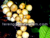 Duku (Lansium domesticum) Duku is round in shape and slightly bigger than a golf ball. It grows in clusters with a thick leathery skin which is in golden brown colour and can be peeled into segments when gently pressed on the top of the fruit. Each fruit composed of a few segments of juicy and refreshing flesh that is tangy sour to sweet taste. Some segments may contain small and bitter seeds. The flesh is usually white but some are pink. Duku is originated from West Malaysia but it is cultivated through out the whole region nowadays. It takes about fifteen years for a duku tree to reach maturity; but the wait is worthwhile as they bear clusters of fruit twice a year thereafter. There are farmers blend both duku and langsat and produce a new innovation species, that is the Duku-Langsat which bears the characteristic of both duku and langsat. In Terengganu, duku is cultivated in Manir area in Kuala Terengganu. During the harvest season, there are lorries lining up outside the orchards as to collect and weight the fruits then distribute to other areas later.